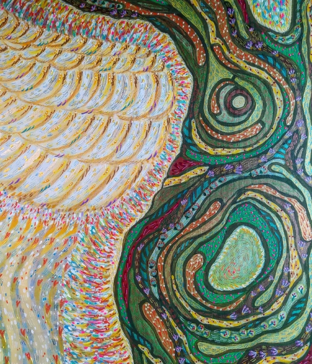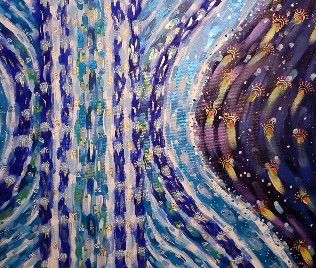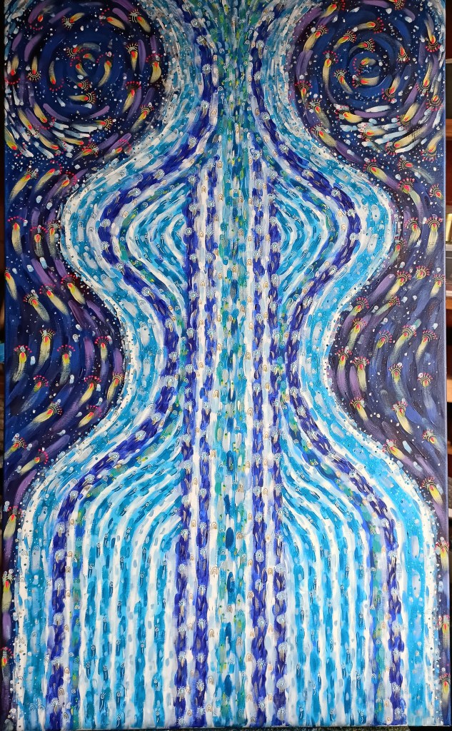 104 – “dentro uno sguardo danzano le nostre anime stringendosi in un abbraccio” acrilico su tela 70×120 cm 25/05/2022 – disponibile